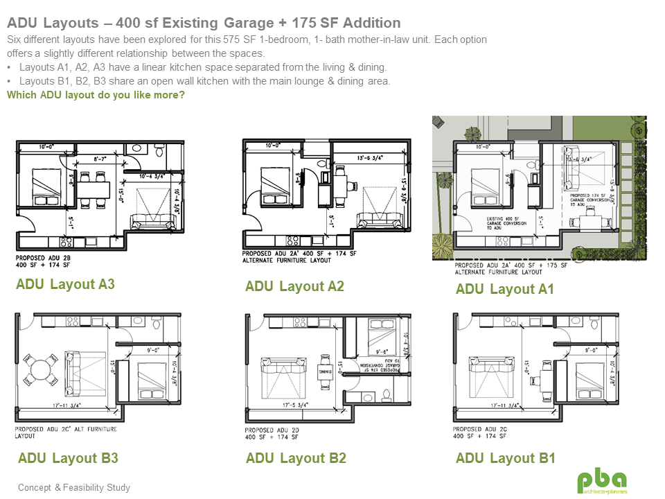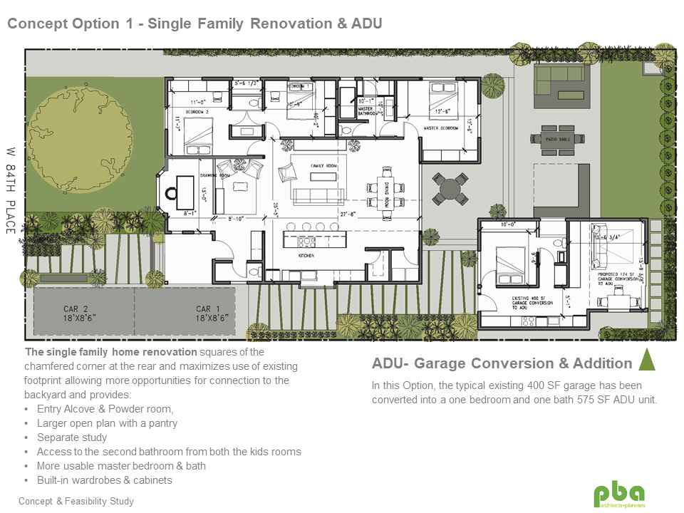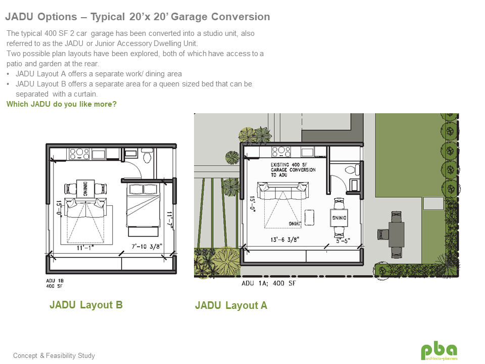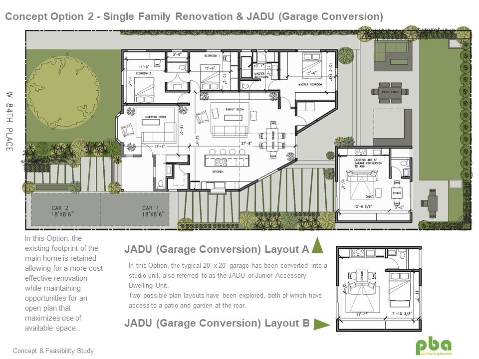 ADU is what most folks have been calling a mother-in-law unit or a granny flat or a guest house. It can now be a rental income unit that home owners can legally (finally!) have on their own residential lot. The scope for this project is renovation of the existing main home and converting their garage into an ADU for one of the mothers of the couple. The project is in early concept design and feasibility stage. See the in-progress plans and layout options for converting the existing 2-car garage into an ADU or a JADU (Junior ADU) and renovation of the main home we are working on.